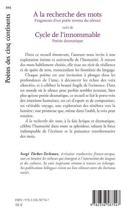 Dans ce recueil émouvant, l'auteure nous invite à une exploration intime et universelle de l'humanité. À travers des mots habilement choisis, elle tisse un récit de résilience et de quête de sens, transcendant les frontières du langage. Chaque poème est une invitation à plonger dans les profondeurs de l'âme, à découvrir les échos des voix silenciées, et à célébrer la beauté fragile de l'existence. Dans un monde où le silence peut parfois sembler écrasant, bien plus qu'une poésie dramatique, ce recueil se fait le porte-voix des émotions humaines, un cri d'espoir et de compassion; un véritable voyage, une exploration des ténèbres vers la lumière; une promesse que, même dans l'oubli, la voix peut renaître. À la recherche des mots, à la fois lyrique et dramatique, célèbre l'humanité dans toute sa splendeur, saluant la force indomptable de l'écriture et la puissance transformative des mots.
