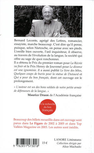 Bernard Leconte, agrégé des Lettres, romancier, essayiste, marche beaucoup. C'est dire qu'il pense, puisque, selon Nietzsche, on pense avec ses pieds. L'oreille bien ouverte, l'œil inquisiteur, il observe, au travers de l'évolution de la langue, la société qui offre au sage de quoi ronchonner. Il a obtenu le Prix du premier roman pour "La Récrée va finir" et le Prix Henry de Jouvenel pour "Le divorce est une ignominie". Il a aussi publié "Le livre des bêtes", "Quelques coups de burin pour la statue de Dutourd" et "Qui a peur du bon français", dont cet ouvrage est le prolongement.