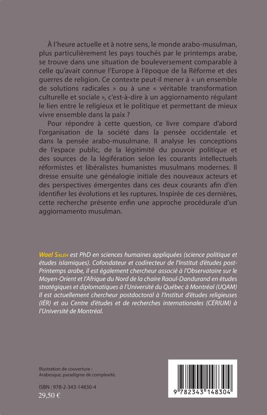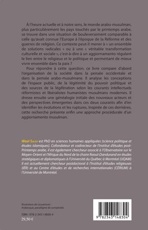 Les bouleversements dans le monde arabo-musulman peuvent-ils mener à un aggiornamento régulant le lien entre le religieux et le politique et permettant de mieux vivre ensemble dans la paix ? Pour répondre à cette question, ce livre compare d'abord l'organisation de la société dans la pensée occidentale et dans la pensée arabo-musulmane. Il analyse les conceptions de l'espace public, de la légitimité du pouvoir politique et des sources de la légifération selon les courants intellectuels réformistes et libéralistes humanistes musulmans modernes.