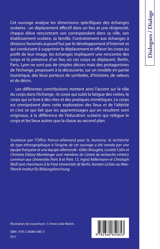 Cet ouvrage analyse les dimensions spécifiques des échanges scolaires, qui contrairement aux échanges à distance favorisés aujourd'hui par le développement d'Internet, impliquent une rencontre des corps et la présence d'un lieu où ces corps se déplacent. Les contributions mettent l'accent sur le rôle du corps dans l'échange, omniprésent dans l'exploration des lieux et de l'altérité, à la différence de l'éducation scolaire qui les relègue au second plan.