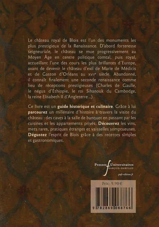 Ce livre est un guide historique et culinaire. Grâce à lui parcourez un millénaire d’histoire à travers la visite du château : des caves à la salle de banquet en passant par les cuisines et les appartements privés. Découvrez les vins, mets rares, pratiques étranges et vaisselles somptueuses. Dégustez l’esprit de Blois grâce à des recettes simples et gastronomiques.