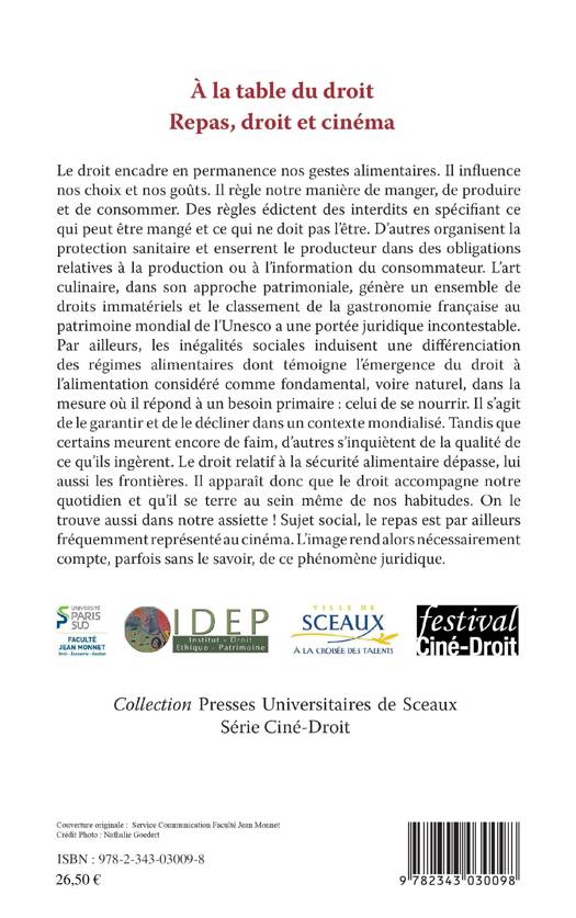 Le droit encadre en permanence nos gestes alimentaires. Il influence nos choix, édicte des règles qui spécifient ce qui peut être mangé et ce qui ne doit pas l'être, d'autres qui organisent la protection sanitaire, le droit à l'alimentation, ou les droits relatifs au patrimoine. Il apparaît donc que le droit se terre au sein de nos habitudes et de nos assiettes ! Le repas est d'ailleurs fréquemment représenté au cinéma et l'image rend compte, parfois sans le savoir, de ce phénomène juridique.