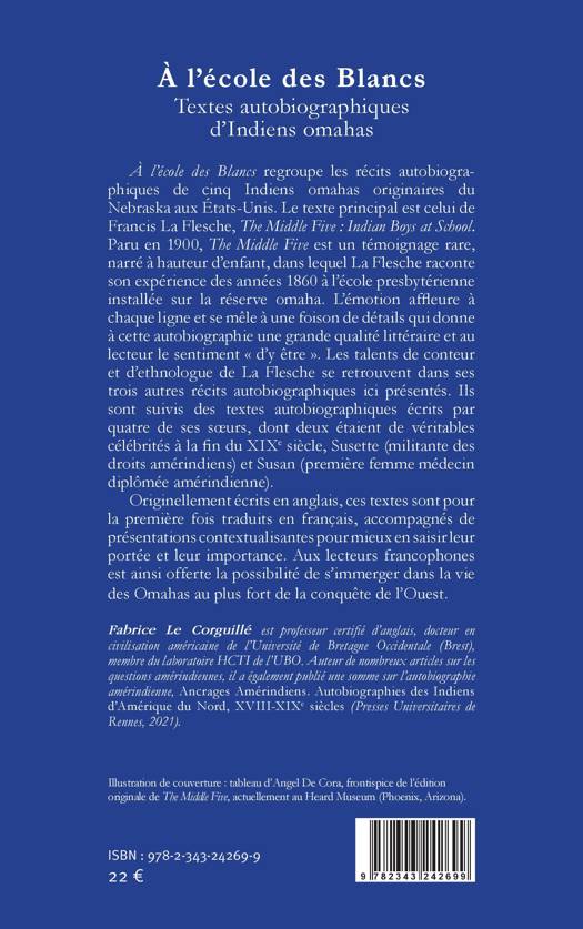À l'école des Blancs regroupe les récits autobiographiques de cinq Indiens omahas originaires du Nebraska aux États-Unis. Le texte principal est celui de Francis La Flesche, The Middle Five : Indian Boys at School. Paru en 1900, The Middle Five est un témoignage rare, narré à hauteur d'enfant, dans lequel La Flesche raconte son expérience des années 1860 à l'école presbytérienne installée sur la réserve omaha. Originellement écrits en anglais, ces textes sont pour la première fois traduits en français, accompagnés de présentations contextualisantes pour mieux en saisir leur portée et leur importance. Aux lecteurs francophones est ainsi offerte la possibilité de s'immerger dans la vie des Omahas au plus fort de la conquête de l'Ouest.