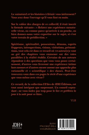 Le surnaturel et les histoires à frémir vous intéressent ? Vous avez donc l'ouvrage qu'il vous faut en main. Sur le cahier des charges de ce collectif, il était inscrit la formule suivante: Relatez une expérience surnaturelle vécue, ou connue parce qu'arrivée à un proche, ou bien donnez-nous votre expertise sur le sujet, si c'est votre terrain de prédilection. Spiritisme, spiritualité, possessions, démons, esprits frappeurs, introspections, visions, visitations, prémonitions, tout cela est dans ce recueil où 12 auteur(e)s vont au gré des chapitres vous emmener sur des voies parallèles à la réalité établie. Certains de nos auteurs répondent à des questions que vous vous posez certainement, d'autres vous livreront une expérience intime hors normes et d'autres encore auront une approche plus rationnelle et scientifique des choses. Peut-être trouverez-vous dans ces pages le récit d'une expérience que vous-même avez vécue ? Ce recueil, de la collection F.Files de JDH Éditions, est tout aussi intrigant que surprenant. Un conseil cependant: ne vous isolez pas trop pour le lire et préférez le jour à la nuit pour ce faire.