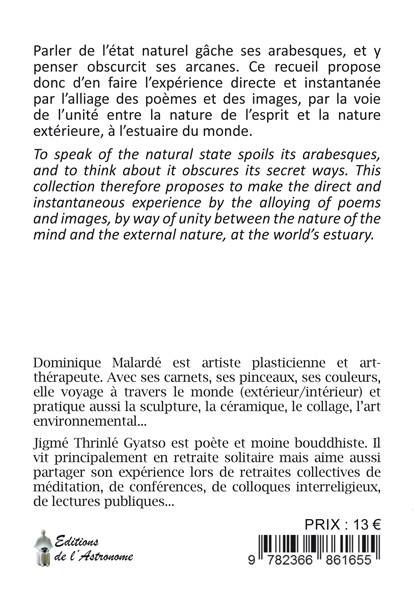 L'état naturel, on peut toujours en parler, et beaucoup en parlent en réifiant ses arabesques. On peut aussi y penser, et beaucoup y pensent, sans pourtant jamais comprendre ses arcanes. L'état naturel, il s'agit surtout d'en faire l'expérience directe, instantanée. Et cette expérience est indissociable de celle de la nature de l'esprit. Elle peut aussi passer par celle de la nature dite «extérieure». C'est cet alliage naturel, entre l'intérieur de chaque être et l'environnement, qu'exprime ici l'alliage harmonieux entre les oeuvres de Dominique Malardé et les textes de Jigmé Thrinlé Gyatso. Ce livre est une rencontre à l'estuaire du monde entre deux sensibilités humaines, artistiques et spirituelles, un enchantement pour le corps, le regard et l'esprit. Trilingue : Français, Anglais, Arabe