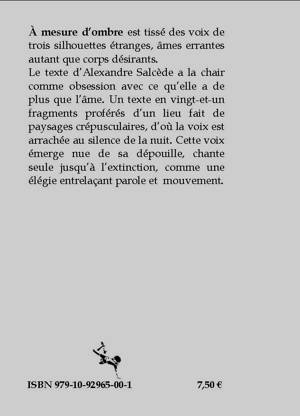 À mesure d’ombre est tissé des voix de trois silhouettes étranges, âmes errantes autant que corps désirants. Le texte d’Alexandre Salcède a la chair comme obsession avec ce qu’elle a de plus que l’âme. Un texte en vingt-et-un fragments proférés d’un lieu fait de paysages crépusculaires, d’où la voix est arrachée au silence de la nuit. Cette voix émerge nue de sa dépouille, chante seule jusqu’à l’extinction, comme une élégie entrelaçant parole et mouvement.