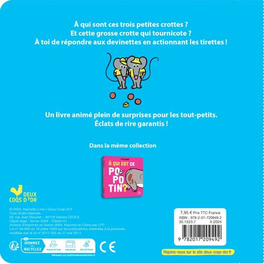 À qui sont ces trois petites crottes ? Et cette grosse crotte qui tournicote ? À toi de répondre aux devinettes en actionnant les tirettes !