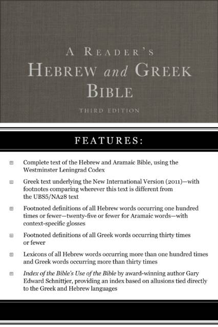 A Reader's Hebrew and Greek Bible: Third Edition is a classic and essential tool for students of biblical Hebrew and Greek. The Reader presents the Hebrew and Aramaic text of the Westminster Leningrad Codex (minus the critical apparatus) and the Greek text underlying the New International Version alongside the English translation.