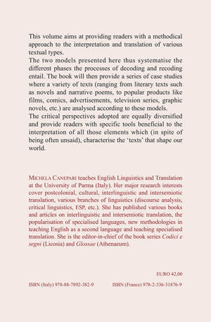 Une approche méthodologique pour l'interprétation et la traduction (de l'anglais ou vers l'anglais) de différents genres de texte. À travers l'analyse de toute une série de cas (ouvrages littéraires, films, BD, annonces publicitaires...), ce manuel rédigé en anglais systématise les phases du processus de décodification et de recodification dans le passage d'une langue à une autre.
