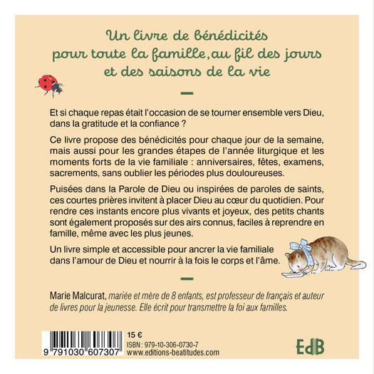 Et si chaque repas était l’occasion de se tourner ensemble vers Dieu, dans la gratitude et la confiance ? Ce livre propose des bénédicités pour chaque jour de la semaine, mais aussi pour les grandes étapes de l’année liturgique et les moments forts de la vie familiale : anniversaires, fêtes, examens, sacrements, sans oublier les périodes plus douloureuses. Puisées dans la Parole de Dieu ou inspirées de paroles de saints, ces courtes prières invitent à placer Dieu au cœur du quotidien. Pour rendre ces instants encore plus vivants et joyeux, des petits chants sont également proposés sur des airs connus, faciles à reprendre en famille, même avec les plus jeunes. Un livre simple et accessible pour ancrer la vie familiale dans l’amour de Dieu et nourrir à la fois le corps et l’âme.