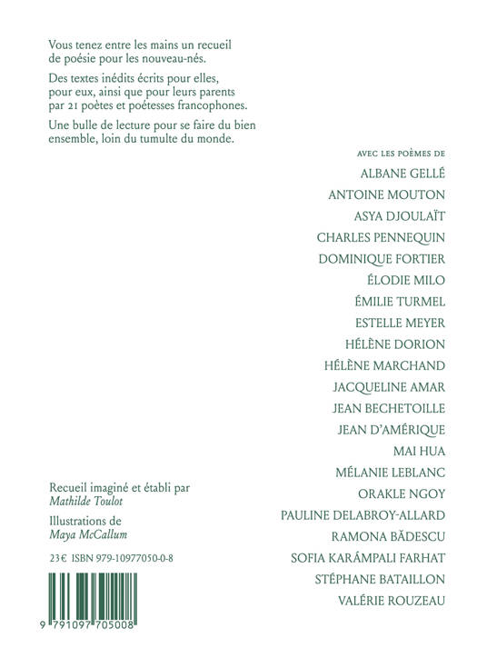 21 poètes et poétesses contemporains ont composé 30 poèmes inédits spécialement pour les Éditions Charlie Crane. Les textes racontent la grossesse, l'accouchement, la naissance et présentent le monde à venir au nouveau-né. Ils offrent aux parents des mots pour verbaliser l'immense aventure qu'ils viennent de traverser ensemble.