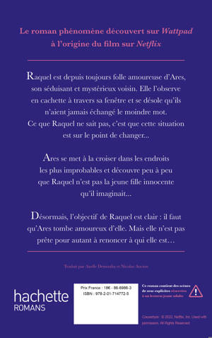 Raquel a toujours été folle amoureuse d’Ares, son voisin aussi séduisant que mystérieux. Depuis des années, elle l’observe chaque jour à travers sa fenêtre sans qu’il s’en doute le moins du monde : badboy aux abdos en acier, étudiant brillant à l’avenir tout tracé… aucun détail de la vie d’Ares n’échappe à Raquel.
