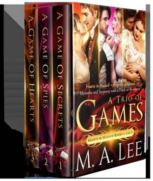 Welcome to A Trio of Games, the collection of the first three books in M.A. Lee's Hearts in Hazard series of Regency mysteries and suspense ~ with a dash of romance.