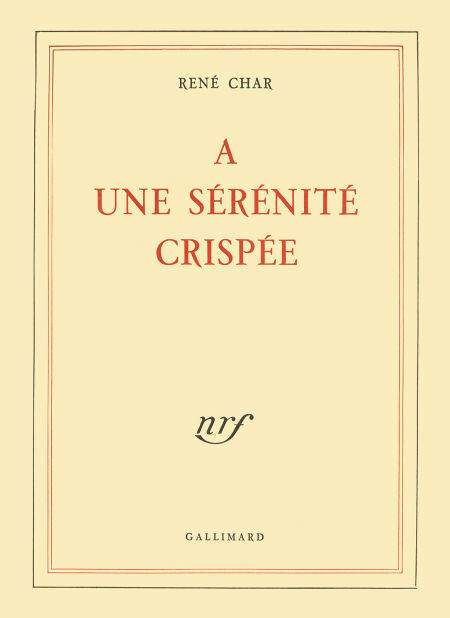 "Nous sommes, ce jour, plus près du sinistre que le tocsin lui-même ; c'est pourquoi il est grand temps de nous composer une santé du malheur. Dût-elle avoir l'apparence de l'arrogance du miracle." Ainsi s'exprime René Char dans À une sérénité crispée. Ce recueil de notes, d'aphorismes, de réflexions poétiques est un ouvrage aussi essentiel que les Feuillets d'Hypnos. D'un laconisme souvent déchirant, il est, de plus, un manuel de courage témoignant que l'homme lucide et le poète clairvoyant ne font qu'un.