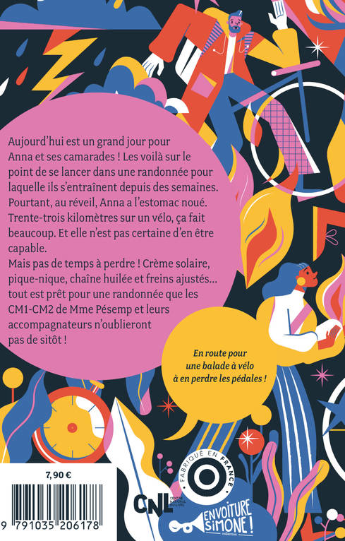 Aujourd'hui est un grand jour pour Anna et ses camarades ! Les voilà sur le point de se lancer dans une randonnée pour laquelle ils s'entraînent depuis des semaines. Pourtant, au réveil, Anna a l'estomac noué. Trente-trois kilomètres sur un vélo, ça fait beaucoup. Et elle n'est pas certaine d'en être capable. Mais pas de temps à perdre ! Crème solaire, pique-nique, chaîne huilée et freins ajustés... tout est prêt pour une randonnée que les CM1-CM2 de Mme Pésemp et leurs accompagnateurs n'oublieront pas de sitôt !