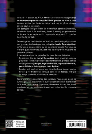 Voici la 11e édition de À VOS MATHS : elle contient les épreuves de mathématiques du concours EDHEC posées de 2014 à 2025 toujours suivies des barèmes qui ont été mis en place chaque année pour ce concours.