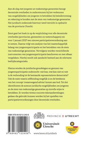 Aan de slag met jongeren en toekomstige generaties beoogt decentrale overheden te ondersteunen bij het verkennen van mogelijkheden om jongeren te betrekken bij beleidsvorming en rekening te houden met de stem van toekomstige generaties. Het juridisch onderzoek hiervoor werd verricht in opdracht van de provincie Utrecht. Eerst gaat het boek in op de verplichting voor alle decentrale overheden (provincies, gemeenten en waterschappen) om voor 1 januari 2027 een nieuwe participatieverordening aan te nemen. Daarna volgt een analyse van het maatschappelijk belang van jongerenparticipatie en het betrekken van de stem van toekomstige generaties. Vervolgens worden verschillende instrumenten van jongerenparticipatie beschreven en met elkaar vergeleken. Hierbij wordt ook aandacht besteed aan de relevante leeftijdscategorieën. Hierna worden de juridische grondslagen en grenzen van jongerenparticipatie onderzocht: wat kan, wat kan niet en wat is de verhouding tot de bestaande representatieve democratie? Ook de mate waarin zelfbinding mogelijk is en de betekenis van het concept ‘zwaarwegend advies’ komen aan bod. Tot slot identificeren de auteurs juridische mogelijkheden om jongeren en de stem van toekomstige generaties op zinvolle wijze te betrekken. Er worden tevens concrete tekstaanbevelingen gedaan die gebruikt kunnen worden bij het opstellen van participatieverordeningen door decentrale overheden.