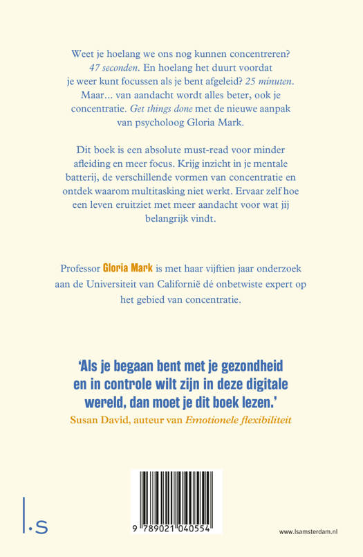 Gloria Mark over haar boek: Mijn onderzoek van de afgelopen vijftien jaar laat zien dat onze aandachtspanne afneemt. Dit is alarmerend. Maar het betekent niet dat we gedoemd zijn tot een leven zonder focus. Ons vermogen om te focussen is niet weg, maar de manier waarop we focussen verandert, en ik laat zien hoe.