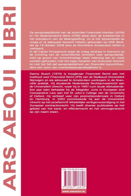 De aansprakelijkheid van de Autoriteit Financiële Markten (AFM) en De Nederlandsche Bank (DNB) staat door de kredietcrisis in het brandpunt van de belangstelling. Zo is het bijvoorbeeld de vraag of zij adequaat toezicht hebben gehouden op DSB Bank, die op 19 oktober 2009 door de Rechtbank Amsterdam failliet is verklaard. In dit Cahier Privaatrecht staat de vraag centraal in hoeverre bij de invulling van de verschillende vereisten voor aansprakelijkheid op grond van onrechtmatige daad rekening kan en moet worden gehouden met het eigen karakter van financieel toezicht en met het feit dat aansprakelijkheid van financiële toezichthouders een vorm van overheidsaansprakelijkheid is.