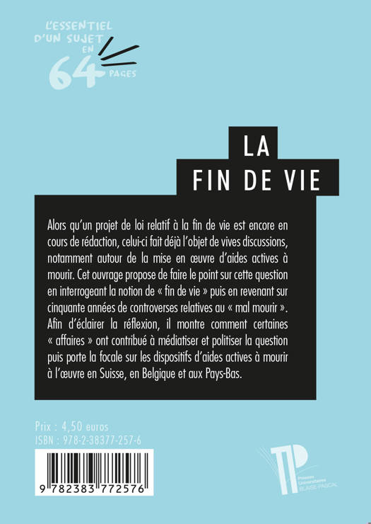 Alors qu'un projet de loi relatif à la fin de vie est encore en cours de rédaction, celui-ci fait déjà l’objet de vives discussions, notamment autour de la mise en œuvre d’aides actives à mourir. Cet ouvrage propose de faire le point sur cette question en interrogeant la notion de « fin de vie » puis en revenant sur cinquante années de controverses relatives au « mal mourir ». Afin d’éclairer la réflexion, il montre comment certaines « affaires » ont contribué à médiatiser et politiser la question puis porte la focale sur les dispositifs d’aides actives à mourir à l’œuvre en Suisse, en Belgique et aux Pays-Bas.