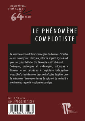 Le phénomène complotiste occupe une place de choix dans l'attention de nos contemporains. Il inquiète, il fascine et prend figure de défi pour ceux qui sont attachés à la démocratie et à l'État de droit. Sociologues, psychologues et psychanalystes, philosophes et historiens se sont penchés sur le complotisme. Cette synthèse accessible d’un historien nourri des apports d’autres disciplines cerne le phénomène, l’interroge en termes de rupture et de continuité et questionne son rapport à la culture démocratique.