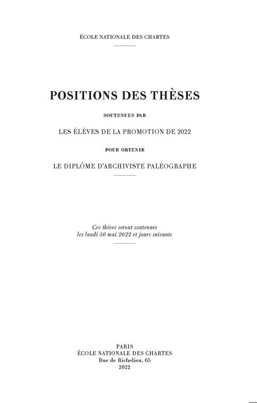 Les Positions des thèses soutenues par les élèves pour obtenir le diplôme d'archiviste paléographe sont publiées annuellement par l'École des chartes depuis 1849. Elles regroupent des résumés longs des thèses soutenues lors de l'année en cours.