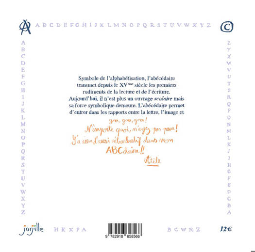 Symbole de l'alphabétisation, l'abécédaire transmet depuis le XVe siècle les premiers rudiments de la lecture et de l'écriture. Aujourd'hui, il n'est plus un « ouvrage scolaire » mais sa force symbolique demeure. L'abécédaire permet d'entrer dans les rapports entre la lettre, l'image et l'arbitraire du classement alphabétique. Mais, n'ayez pas peur il n'y a rien d'aussi rébarbatif dans l'ABC d'Atèle, seul l'amusement est au rendez-vous...