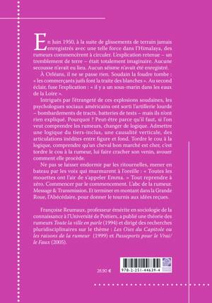 English summary: An essential sociological reference work on the phenomenon of rumour.Francoise Reumaux, Professor Emeritus in Sociology of Knowledge at Universite de Poitiers, has published a theory of rumour called Toute la ville en parle (1994), and directed pluridisciplinary research on the topic in Les Oies du Capitole ou les raisons de la rumeur (1999) and Passeports pour le Vrai / le Faux (2005).French description: En Juin 1950, a la suite de glissements de terrain jamais enregistres avec une telle force dans l'Himalaya, des rumeurs commencerent a circuler. L'explication retenue - un tremblement de terre - etait totalement imaginaire. Aucune secousse n'avait eu lieu. Aucun seisme n'avait ete enregistre. A Orleans, il ne se passe rien. Soudain la foudre tombe: les commercants juifs font la traite des blanches . Au second eclair, fuse l'explication: il y a un sous-marin dans les eaux de la Loire . Intrigues par l'etrangete de ces explosions soudaines, les psychologues sociaux americains ont sorti l'artillerie lourde - bombardements de tracts, batteries de tests - mais ils n'ont rien explique. Pourquoi ? Peut-etre parce qu'il faut, si l'on veut comprendre les rumeurs, changer de logique. Admettre une logique du tiers-inclus, une causalite verticale, des articulations inedites entre figure et fond. Tordre le cou a la logique, comprendre qu'un cheval bon marche est cher, c'est tordre le cou a la rumeur, lui faire cracher son venin, avouer comment elle procede. Ne pas se laisser endormir par les ritournelles, mener en bateau par les voix qui murmurent a l'oreille: Toutes les mouettes ont l'air de s'appeler Emma. Tout reprendre a zero. Commencer par le commencement. L'abc de la rumeur. Message & Transmission. Et terminer en montant dans la Grande Roue, l'Abecedaire, pour donner le tournis aux idees recues.