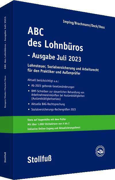 Für alle Fälle auf der sicheren SeiteDer Ratgeber ABC des Lohnbüros bietet ausführliche Erläuterungen und Hilfestellungen zu allen Fragen der Lohn- und Gehaltsabrechnung, zugänglich über zahlreiche Suchbegriffe von A wie Abfindungen bis Z wie Zuschläge.Mit der rechtsgebietsübergreifenden Darstellung werden die maßgebenden Grundlagen des Lohnsteuerrechts, des Sozialversicherungsrechts und des Arbeitsrechts dargestellt. Sie erhalten alle notwendigen Informationen direkt aus einer Quelle, veranschaulicht durch viele Praxisbeispiele, Übersichten und Schaubilder. Alles "amtlich" belegt mit Urteilen, Verwaltungserlassen und Besprechungsergebnissen der Sozialversicherungsträger. Die inhaltlichen SchwerpunkteABC-Form mit über 1.000 Stichworten zur schnellen RecherchePraxisbezogene und leicht verständliche Darstellungsweise mit zahlreichen Beispielen und SchaubildernKennzeichnung der verschiedenen Sachverhalte hinsichtlich Lohnsteuer- und SozialversicherungspflichtWerkbegleitende Online-Datenbank mit kostenlosem Online-AktualisierungsdienstDas ist neuReform der Pflegeversicherung durch das Gesetz zur Unterstützung und Entlastung in der Pflege (Pflegeunterstützungs- und -entlastungsgesetz (PUEG) mit einer Erhöhung des Pflegeversicherungsbeitragssatzes und des Kinderlosenzuschlags sowie der Einführung gestaffelter Beitragsabschläge für kinderreiche FamilienGeänderte Programmablaufpläne für den Lohnsteuerabzug ab dem 1.7.2023 mit Anwendung spätestens ab dem 1.9.2023Änderungen auf Grund des KrankenhauspflegeentlastungsgesetzPfändungsfreigrenzenbekanntmachung 2023Gesetz zur Förderung eines inklusiven ArbeitsmarktsNeueste Verwaltungsverlautbarungen: u.a. das Anwendungsschreiben des BMF zum Entlastungsbetrag für Alleinerziehende oder das BMF-Schreiben zur Bedeutung des OECD-Musterkommentars für die Auslegung von Abkommen zur Vermeidung der DoppelbesteuerungInformationen zu grundlegenden, aktuellen Gesetzesvorhaben wie z.B. im Bereich der Vermögensbeteiligungen durch den Referentenentwurf zum Zukunftsfinanzierungsgesetz oder der Gesetzesentwurf zur Änderung des Arbeitszeitgesetzes und anderer Vorschriften u.a. mit einer möglichen elektronischen Erfassungspflicht der Arbeitszeiten