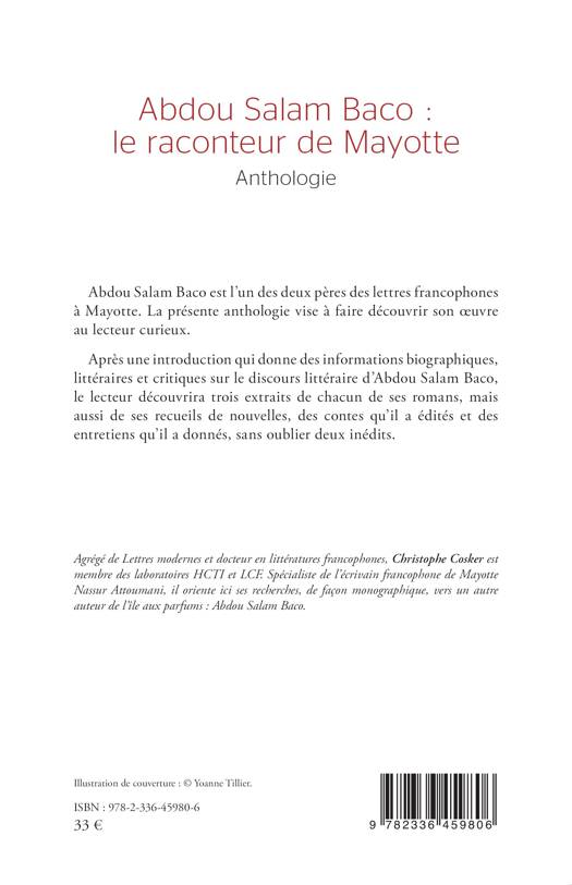 Abdou Salam Baco est l'un des deux pères des lettres francophones à Mayotte. La présente anthologie vise à faire découvrir son oeuvre au lecteur curieux. Après une introduction qui donne des informations biographiques, littéraires et critiques sur le discours littéraire d'Abdou Salam Baco, le lecteur découvrira trois extraits de chacun de ses romans, mais aussi de ses recueils de nouvelles, des contes qu'il a édités et des entretiens qu'il a donnés, sans oublier deux inédits.