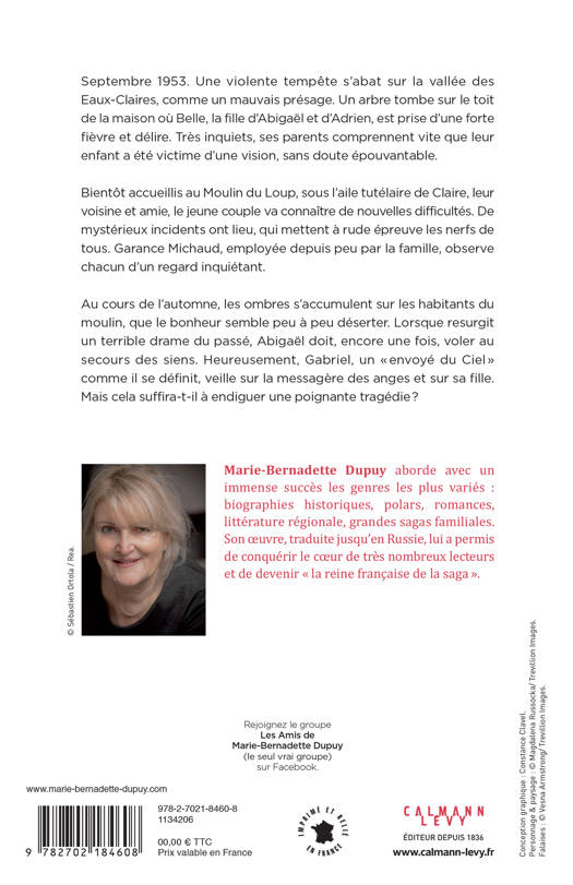 Septembre 1953. Une violente tempête s’abat sur la vallée des Eaux-Claires, comme un mauvais présage. Un arbre tombe sur le toit de la maison où Belle, la fille d’Abigaël et d’Adrien, est prise d’une forte fièvre et délire. Très inquiets, ses parents comprennent vite que leur enfant a été victime d’une vision, sans doute épouvantable. Bientôt accueillis au Moulin du Loup, sous l’aile tutélaire de Claire, leur voisine et amie, le jeune couple va connaître de nouvelles difficultés. De mystérieux incidents ont lieu, qui mettent à rude épreuve les nerfs de tous. Garance Michaud, employée depuis peu par la famille, observe chacun d’un regard inquiétant. Au cours de l’automne, les ombres s’accumulent sur les habitants du moulin, que le bonheur semble peu à peu déserter. Lorsque resurgit un terrible drame du passé, Abigaël doit, encore une fois, voler au secours des siens. Heureusement, Gabriel, un « envoyé du Ciel » comme il se définit, veille sur la messagère des anges et sur sa fille. Mais cela suffira-t-il à endiguer une poignante tragédie ?