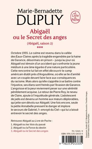 Octobre 1955. Le calme est revenu dans la vallée des Eaux-Claires depuis la tragédie engendrée par la haine de Garance, désormais en prison. Mais Abigaël est témoin d’un accident de voiture et la jeune médium vit alors une nouvelle expérience, confrontée à une âme égarée d’une nature particulière. Cette rencontre lui permet de découvrir le camp américain établi près d’Angoulême, où elle se lie d’amitié avec un couple devant faire face aux conséquences du racisme. Prête à se battre contre l’injustice, ses élans sont freinés par l’évasion de Garance. L’angoisse et la peur reviennent peser sur une sérénité péniblement acquise. Le retour de Pierre Roy, le neveu de Claire, ajoute à l’inquiétude générale. L’adolescent de jadis est devenu un homme aux mœurs déplorables, qui jette son dévolu sur Abigaël. Une fois encore, seule la petite Annabelle pressent le danger et implore le secours de Gabriel, l’« envoyé du Ciel » qui lui a laissé entrevoir le secret des anges.