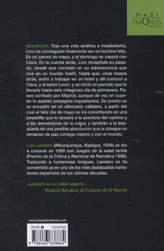 Tras una vida errática e insatisfecha, Lino ha conseguidoáfinalmente ser un hombre feliz. Es un juevesáde mayo y el domingo se casará con Clara. Paseaáconfiado por Madrid cuando se ve envuelto en unáaltercado callejero, a partir del cual el feliz día seáirá convirtiendo en una pesadilla que lo lanzará aála aventura del camino y a las desventuras de laáculpa, y a la búsqueda de una posible absoluciónáque le otorgue un remanso de paz consigo mismoáy con el mundo.