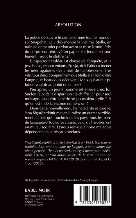 La police découvre le crime comme tout le monde : sur Snapchat. La vidéo montre la victime, Stella, en train de demander pardon avant sa mise à mort. Près du corps sera retrouvé un papier sur lequel est seulement inscrit le chiffre "2". L'inspecteur Huldar est chargé de l'enquête, et la psychologue pour enfants, Freyja, doit l'aider à mener les interrogatoires des amies de l'adolescente. Très vite, tous deux comprennent que Stella était loin d'être l'ange que beaucoup décrivent. Mais qui aurait pu lui en vouloir au point de la tuer ? Peu après, un jeune homme est enlevé chez lui. Sur les lieux de la disparition : le chiffre "3" pour seul message. Jusqu'où la série se poursuivra-t-elle ? Et qu'en est-il de la victime numéro un ? Dans cette nouvelle enquête haletante et cruelle, Yrsa Sigurðardóttir met en lumière un drame terriblement actuel, qui touche tous les pays, tous les pans de la société et toutes les classes, celui du harcèlement en milieu scolaire. Et nous renvoie à notre maladive dépendance aux réseaux sociaux.
