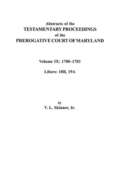 Volume IX of "Abstracts of the Testamentary Proceedings of the Prerogative Court of Maryland (1700-1703)" marks the first one in the series whose coverage is confined solely to the 18th century. consists of abstracts of the records for the period 1700 to 1703. Mr. Skinner has combed through administration, bond, will, inventory, administration accounts, and final balance entries to produce this collection. The abstracts are arranged chronologically by court session. For the most part, the transcriptions state the names of the principals (testators, heirs, witnesses, administrators, and so forth) as well as details of bequests, names of slaves, appraisers, and more.