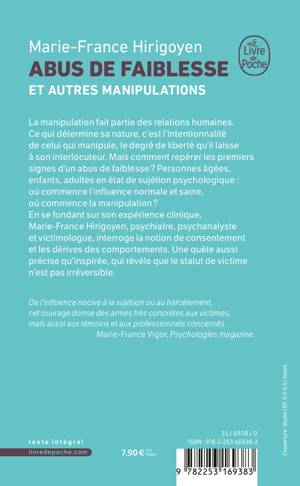 La manipulation fait partie de la vie, ce qui fait la différence, c'est l'intentionnalité. Mais comment repérer les premiers signes d'un abus de faiblesse ? Personnes âgées, enfants, adultes en état de sujétion psychologique: où commence l'influence normale et saine, où commence la manipulation ? En se fondant sur son expérience clinique, Marie-France Hirigoyen, psychiatre, psychanalyste et victimologue, interroge la notion de consentement et les dérives des comportements. Une quète aussi précise qu'inspirée, qui révèle que le statut de victime n'est pas irréversible.De l'influence nocive à la sujétion ou au harcèlement, cet ouvrage donne des armes très concrètes aux victimes, mais aussi aux témoins et aux professionnels concernés. Marie-France Vigor, Psychologies magazine