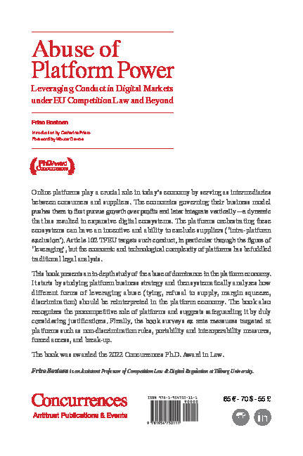 This book presents an in-depth study of the abuse of dominance in the platform economy. It starts by studying platform business strategy and then systematically analyzes how different forms of leveraging abuse (tying, refusal to supply, margin squeeze, discrimination) should be reinterpreted in the platform economy. The book also recognizes the procompetitive role of platforms and suggests safeguarding it by duly considering justifications. Finally, the book surveys ex ante measures targeted at platforms such as non-discrimination rules, portability and interoperability measures, forced access, and break-up.