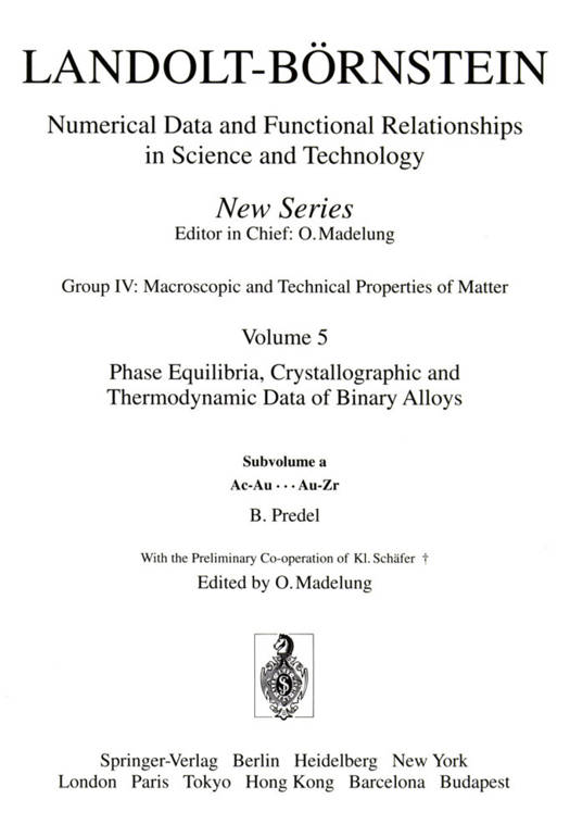 For everyone concerned with the technology and application of metals and alloys and with the development of new metallic materials, a detailed knowledge of phase equilibria is indispensable. Also, information on the thermodynamical and crystallographical data of the systems under investigation is essential, and often metastable crystalline phases as well as quasicrystalline or amorphous alloys are of interest. Vol. IV/5 therefore presents all these data. Because of the large amount available of experimental evidence and thermochemical calculations, a presentation in one volume, as it was realized several decades ago in the widely used book of M. Hansen "Aufbau der Zweistoff-Legierungen" proved to be impossible. So volume IV/5 had to be divided into several subvolumes which cover - in alphabetical order - all binary systems of importance. Subvolume IV/5a, the first of the series, deals with the systems Ac-Au ... Au-Zr. Further subvolumes will follow shortly.