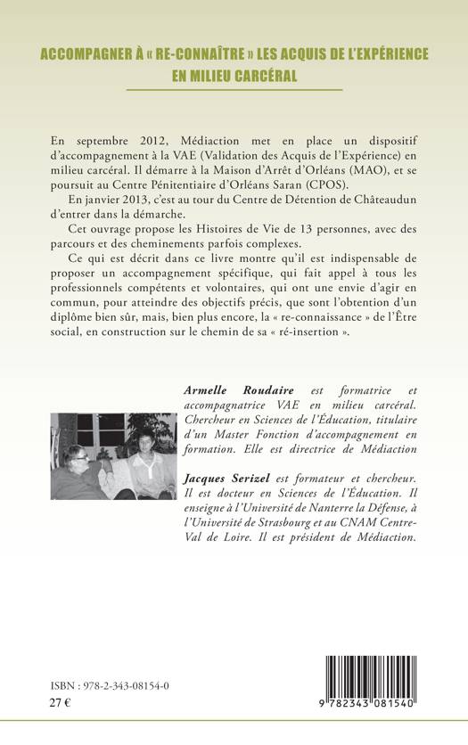 En septembre 2012, Médiaction met en place un dispositif d’accompagnement à la VAE en milieu carcéral. Cet ouvrage propose les Histoires de Vie de 13 personnes, avec des parcours et des cheminements parfois complexes. Ce qui est décrit ici montre qu’il est indispensable de proposer un accompagnement spécifique, qui fait appel à tous les professionnels compétents et volontaires, qui ont une envie d’agir en commun, pour atteindre des objectifs précis, que sont l’obtention d’un diplôme bien sûr, mais, bien plus encore, la « re-connaissance » de l’Être social, en construction sur le chemin de sa « ré-insertion ».