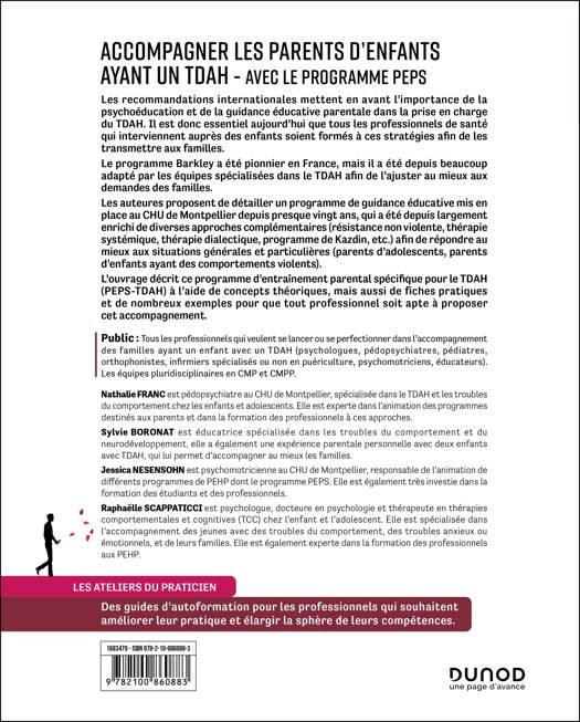 L’ouvrage décrit ce programme d’entraînement parental spécifique pour le TDAH (PEPS-TDAH) à l’aide de concepts théoriques, mais aussi de fiches pratiques et de nombreux exemples pour que tout professionnel soit apte à proposer cet accompagnement.