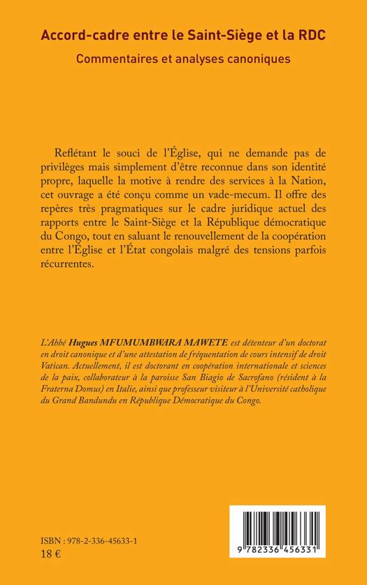 Reflétant le souci de l'Église, qui ne demande pas de privilèges mais simplement d'être reconnue dans son identité propre, laquelle la motive à rendre des services à la Nation, cet ouvrage a été conçu comme un vade-mecum. Il offre des repères très pragmatiques sur le cadre juridique actuel des rapports entre le Saint-Siège et la République démocratique du Congo, tout en saluant le renouvellement de la coopération entre l'Église et l'État congolais malgré des tensions parfois récurrentes.