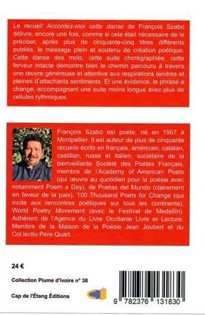 Le recueil de poésie Accordez-moi cette danse de François Szabó délivre, encore une fois, comme si cela était nécessaire de le préciser, après plus de cinquante-cinq titres différents publiés, le message plein et soutenu de création poétique. Cette danse des mots, cette suite chorégraphiée, cette ferveur intacte démontre bien le chemin parcouru à travers une œuvre généreuse et attentive aux respirations tendres et pleines d’attachants sentiments. Et une évidence, le phrasé a changé, accompagnant une suite moins longue avec plus de cellules rythmiques.