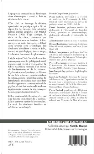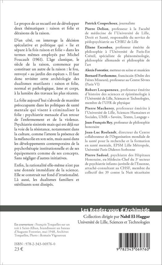 Le propos de ce recueil est de développer deux thématiques : raison et folie et déraisons de la raison. Il interroge la décision spéculative et politique qui lie et sépare à la fois raison et folie dans les termes mêmes employés par Foucault. Celle-ci s'aborde aujourd'hui de manière préoccupante dans les politiques de santé mentale qui visent à criminaliser la folie. La psychiatrie est menacée d'un retour à la violence et à l'enfermement mais est déjà sur la voie de la résistance. Enfin, la rationalité elle-même se construit sur fond d'irrationalité...