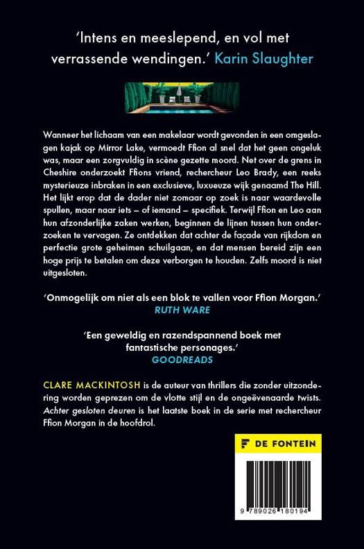 Boek 3 in de Rechercheur Morgan-serie. Wanneer het lichaam van een makelaar wordt gevonden in een omgeslagen kajak op Mirror Lake, vermoedt Ffion al snel dat het geen ongeluk was, maar een zorgvuldig in scène gezette moord. Tegelijkertijd, net over de grens in Cheshire, onderzoekt Ffions vriend, rechercheur Leo Brady, een reeks mysterieuze inbraken in een exclusieve wijk genaamd The Hill. Het lijkt erop dat de dader niet zomaar op zoek is naar waardevolle spullen, maar naar iets — of iemand — specifieks. Terwijl Ffion en Leo hun afzonderlijke zaken onderzoeken, beginnen de lijnen tussen hun onderzoeken te vervagen. Ze ontdekken dat achter de façade van rijkdom en perfectie diepe geheimen schuilgaan. Mensen blijken bereid een hoge prijs te betalen om die geheimen verborgen te houden — zelfs moord is niet uitgesloten.