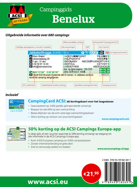 Met de CampingCard ACSI-kortingskaart overnacht u in het laagseizoen tegen een vast en voordelig tarief (€ 13, € 15, € 17, € 19, € 21, € 23, € 25 of € 27 per nacht) op 3.000 campings in 25 Europese landen. De kortingskaart zit bijgesloten in de gids en is voorzien van een QR-code. Met de QR-code kunt u uw kortingskaart online registeren. Zodra u dit heeft gedaan kan de camping uw kortingskaart scannen en checkt u extra snel in. U kunt ook de achterkant van de kortingskaart voorzien van uw gegevens. De camping kan deze dan handmatig overnemen.