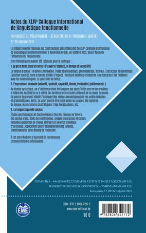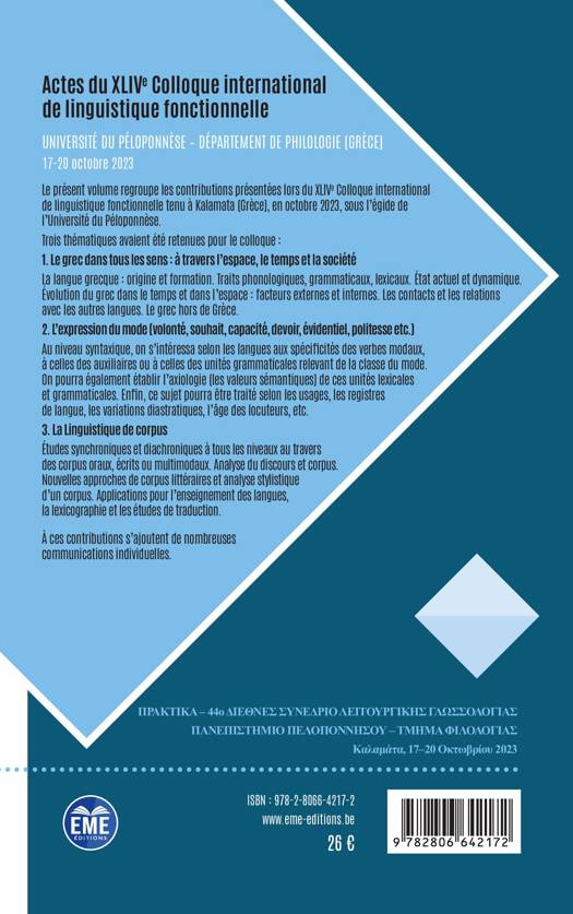 Actes du XLIVe Colloque international de linguistique fonctionnelle UNIVERSITÉ DU PÉLOPONNÈSE - DÉPARTEMENT DE PHILOLOGIE (GRÈCE), 17-20 octobre 2023 Le présent volume regroupe les contributions présentées lors du XLIVe Colloque international de linguistique fonctionnelle tenu à Kalamata (Grèce), en octobre 2023, sous l'égide de l'Université du Péloponnèse. Trois thématiques avaient été retenues pour le colloque: 1. Le grec dans tous les sens: à travers l'espace, le temps et la société La langue grecque: origine et formation. Traits phonologiques, grammaticaux, lexicaux. État actuel et dynamique. Évolution du grec dans le temps et dans l'espace: facteurs externes et internes. Les contacts et les relations avec les autres langues. Le grec hors de Grèce. 2. L'expression du mode (volonté, souhait, capacité, devoir, évidentiel, politesse, etc.) Au niveau syntaxique, on s'intéressa selon les langues aux spécificités des verbes modaux, à celles des auxiliaires ou à celles des unités grammaticales relevant de la classe du mode. On pourra également établir l'axiologie (les valeurs sémantiques) de ces unités lexicales et grammaticales. Enfin, ce sujet pourra être traité selon les usages, les registres de langue, les variations diastratiques, l'âge des locuteurs, etc. 3. La Linguistique de corpus Études synchroniques et diachroniques à tous les niveaux au travers des corpus oraux, écrits ou multimodaux. Analyse du discours et corpus. Nouvelles approches de corpus littéraires et analyse stylistique d'un corpus. Applications pour l'enseignement des langues, la lexicographie et les études de traduction. À ces contributions s'ajoutent de nombreuses communications individuelles.
