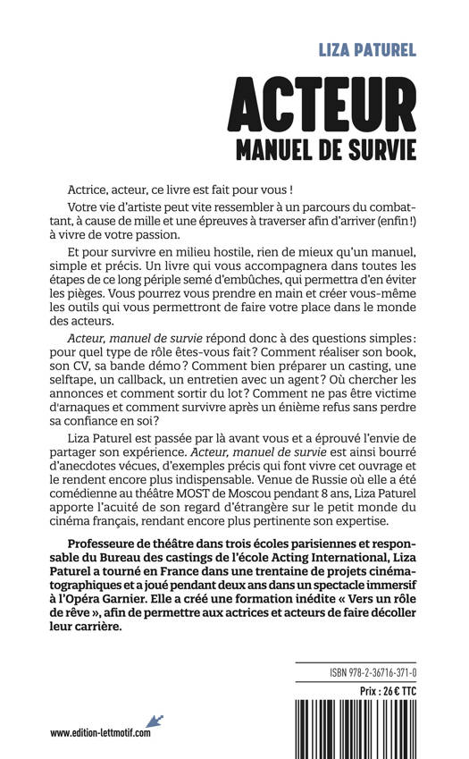 Actrice, acteur, ce livre est fait pour vous ! Votre vie d’artiste peut vite ressembler à un parcours du combattant, à cause de mille et une épreuves à traverser afin d’arriver (enfin !) à vivre de votre passion. Et pour survivre en milieu hostile, rien de mieux qu’un manuel, simple et précis. Un livre qui vous accompagnera dans toutes les étapes de ce long périple semé d’embûches, qui permettra d’en éviter les pièges. Vous pourrez vous prendre en main et créer vous-même les outils qui vous permettront de faire votre place dans le monde des acteurs. Acteur, manuel de survie répond donc à des questions simples : pour quel type de rôle êtes-vous fait ? Comment réaliser son book, son CV, sa bande démo ? Comment bien préparer un casting, une selftape, un callback, un entretien avec un agent ? Où chercher les annonces et comment sortir du lot ? Comment ne pas être victime d'arnaques et comment survivre après un énième refus sans perdre sa confiance en soi ? Liza Paturel est passée par là avant vous et a éprouvé l’envie de partager son expérience. “Acteur, manuel de survie” est ainsi bourré d’anecdotes vécues, d’exemples précis qui font vivre cet ouvrage et le rendent encore plus indispensable. Venue de Russie où elle a été comédienne au théâtre MOST de Moscou pendant 8 ans, Liza Paturel apporte l’acuité de son regard d’étrangère sur le petit monde du cinéma français, rendant encore plus pertinente son expertise. TABLE DES MATIÈRES ///// Avant-propos // Les objectifs, ou quel est son genre de prédilection ? // Formation d’acteur ///// Dossier de comédien // Photos // CV // Bande démo // Vidéo de présentation // Site professionnel // Réseaux sociaux // Portails cinéma ///// Où chercher des castings ? ///// Email au directeur de casting ///// Casting : un mot qui fait peur // Avant le casting // Le jour J // Après le casting ///// Selftape ///// L’acteur et son agent ///// Conclusion // Bibliographie // Index