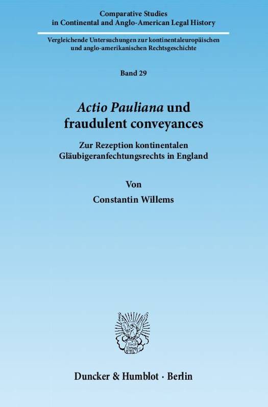 Das englische Gläubigeranfechtungsrecht (fraudulent conveyances law) beruht auf einem Mosaik aus Gesetzen und Urteilen. Constantin Willems analysiert eine Vielzahl dieser Mosaiksteine und weist nach, dass eine große inhaltliche Nähe zum kontinentalen, in Tradition der römischrechtlichen actio Pauliana stehenden Recht besteht. Insbesondere hinsichtlich der Gesetze Henry VIII. (1542-3) und Elizabeth I. (1571) sowie der Leitentscheidungen Case de Bankrupts (1589) und Twyne's Case (1602) liegt eine Rezeption kontinentalen Rechts nahe.