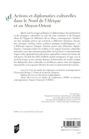 Quels sont les usages politiques et diplomatiques des productions et des pratiques culturelles au sein du vaste territoire et de l’époque allant de l’Égypte de Méhémet Ali au Maroc contemporain ? Fondées sur des exemples précis qui touchent à différents domaines (beaux arts, musique, cinéma, cursus scolaires, pratiques archéologiques...) et à différents espaces (Turquie, Émirats arabes unis, Palestine, Algérie, Tunisie), l’ouvrage éclaire les réalités et les enjeux d’actions culturelles nationales (avec une attention particulière sur la France) et internationales (Ligue arabe) généralement présentées aujourd’hui comme des formes de soft power. Au-delà des effets d’affiche parfois trompeurs, il s’agit, avec le recul du temps et une certaine distance d’observation, de rendre compte des diplomaties dites culturelles ou d’influence prises entre des logiques structurelles et la capacité effective de mise en mouvement des acteurs.