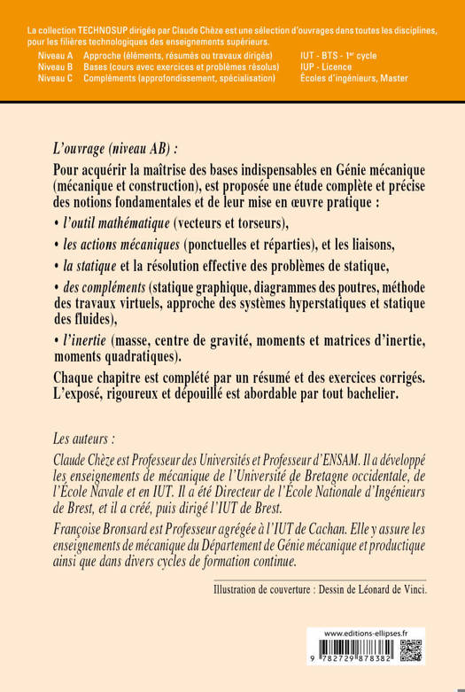 Pour acquérir la maîtrise des bases indispensables en Génie mécanique (mécanique et construction), est proposée une étude complète et précise des notions fondamentales et de leur mise en œuvre pratique : – l'outil mathématique (vecteurs et torseurs), – les actions mécaniques (ponctuelles et réparties), et les liaisons, – la statique et la résolution effective des problèmes de statique, – des compléments (statique graphique, diagrammes des poutres, méthode des travaux. virtuels, approche des systèmes hyperstatiques et statique des fluides), – l'inertie (masse, centre de gravité, moments et matrices d'inertie, moments quadratiques). Chaque chapitre est complété par un résumé et des exercices corrigés. L'exposé, rigoureux et dépouillé est abordable par tout bachelier.